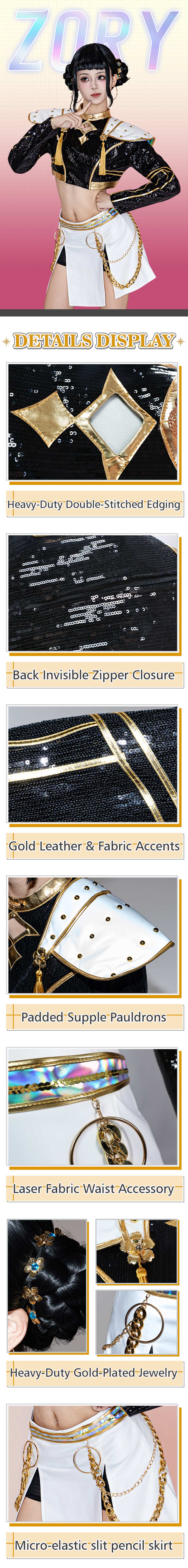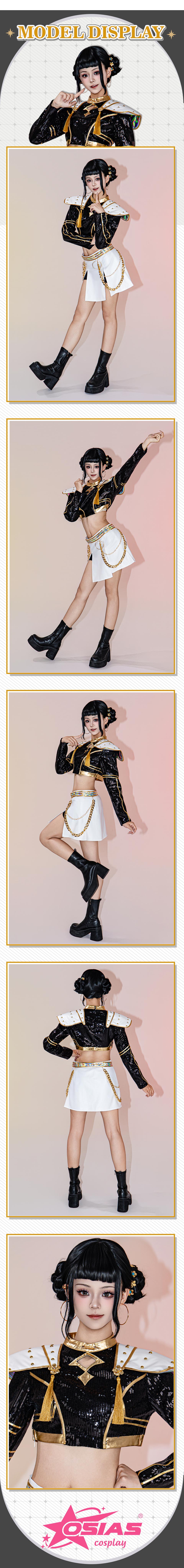 Osias crafted the KPop Demon Hunters Zoey cosplay costume Golden Stage Outfit Black with breathable premium fabrics, gold-edged trims, fitted top and skirt, and detailed accessories for stage-ready comfort.
