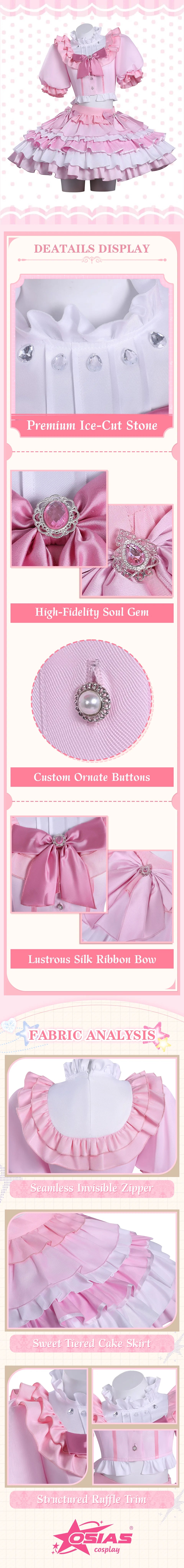 OSIAS crafted this Kaname Madoka cosplay costume with a tiered cake skirt and puff sleeves. The design creates an energetic, cute idol-style stage performance outfit.