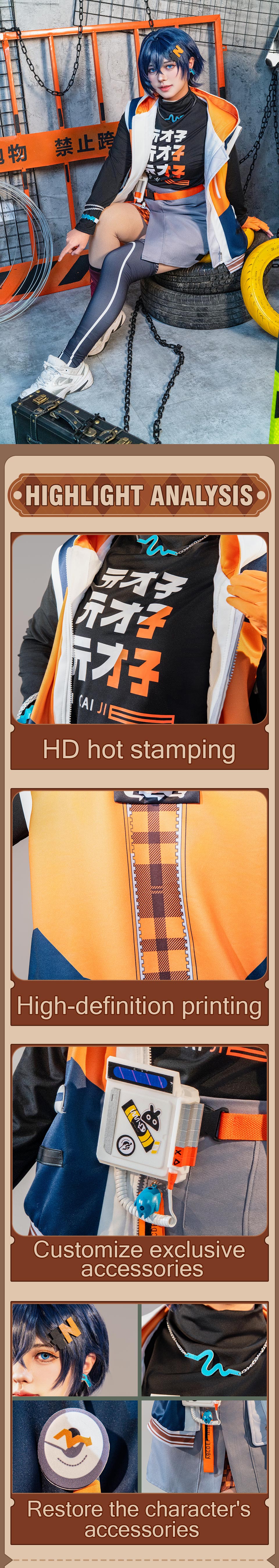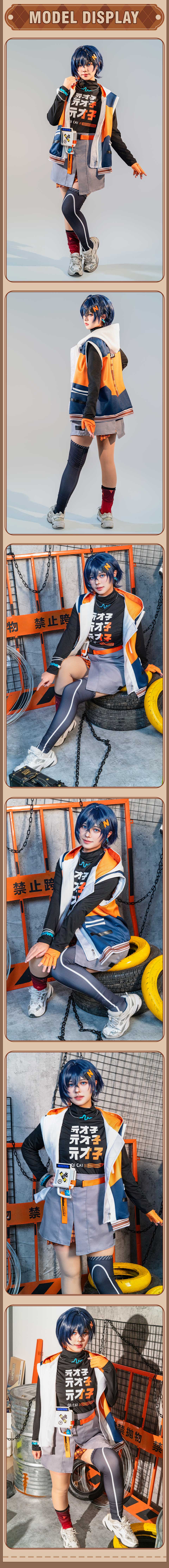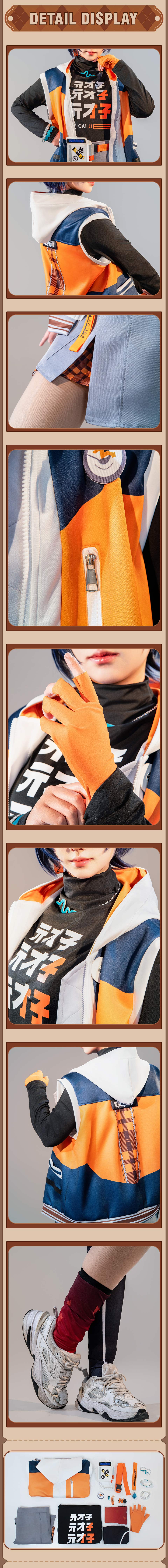 Das Set enthält: Oberteil, Kapuzenjacke, Shorts, Handschuhe, Gürtel, Beinsocken, Abzeichen, Haarspange, Ohrringe, Halskette, Taillenaccessoire, Armband.