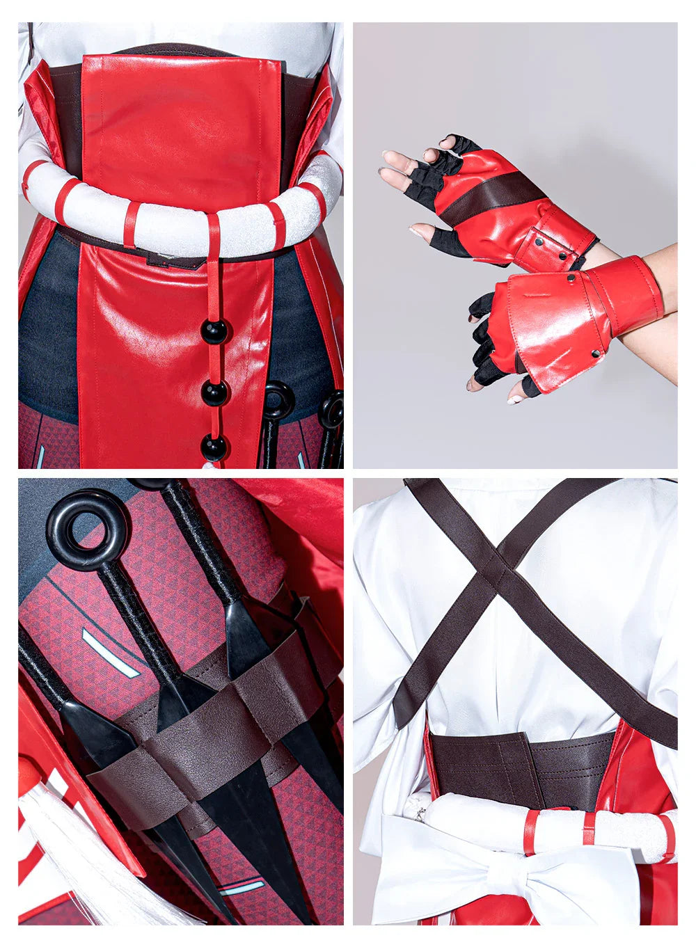 Set Includes: Top, pants, waist ornaments, suspenders, gloves, wrist ornaments, back ornament, and leg ornaments.