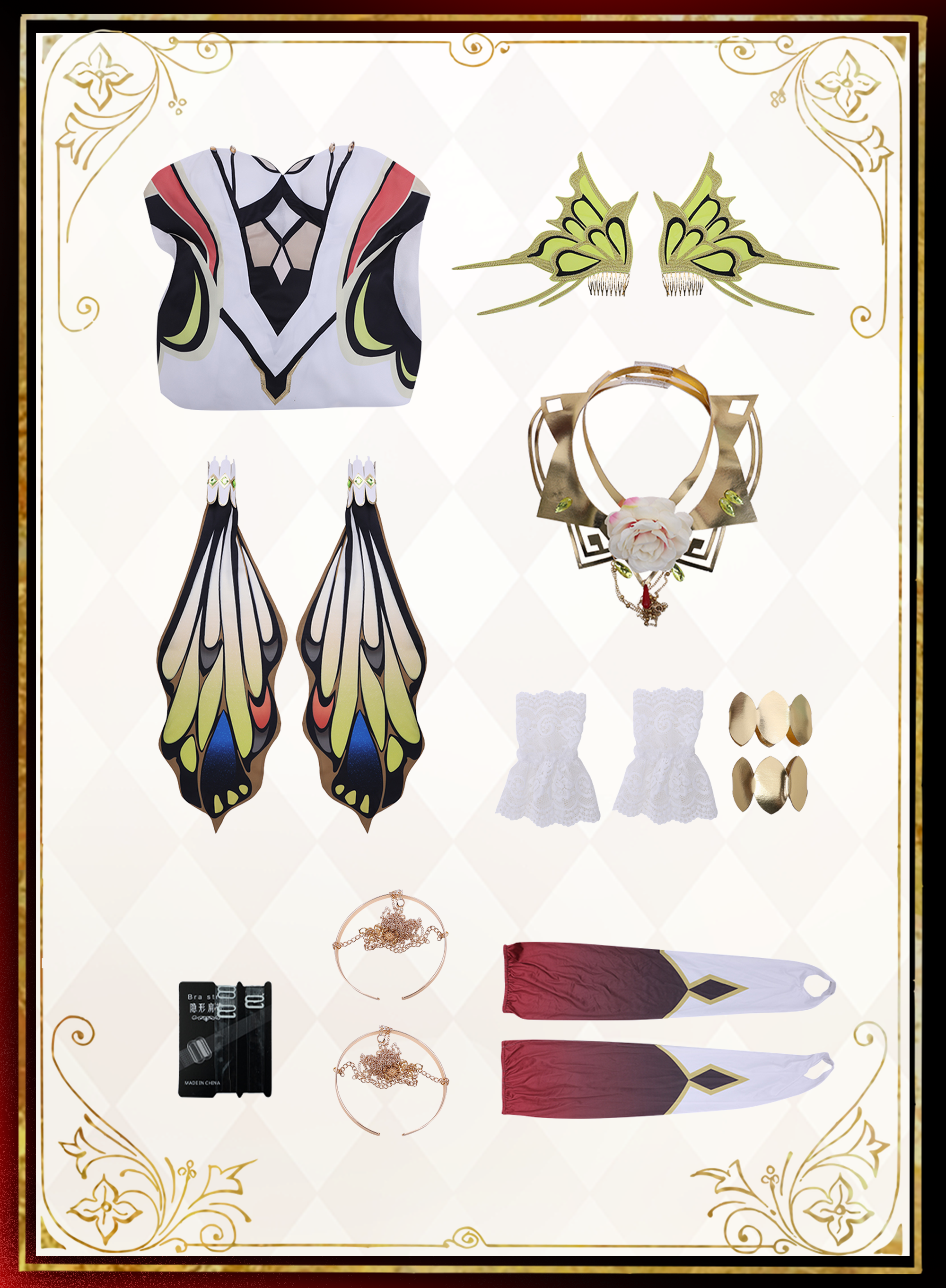 Includes Complete Set: Dress, arm ornaments, headwear, wrist ornaments, necklace, socks, and transparent shoulder straps.