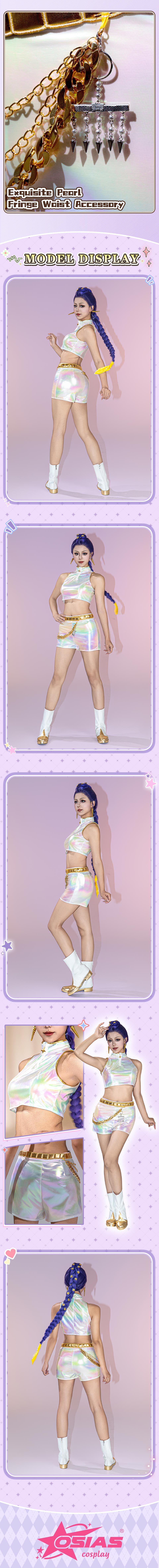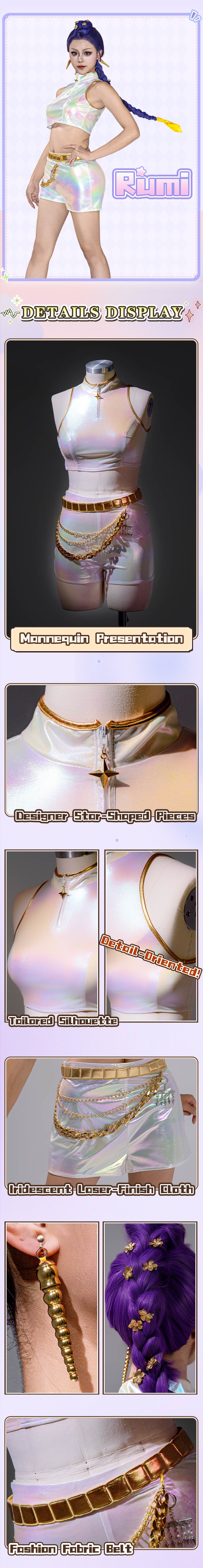 Osias crafted the KPop Demon Hunters Rumi cosplay costume with a dazzling laser-designed top, tailored shorts, headwear, belt, and gold-accented waist ornaments for true-to-US-size comfort.