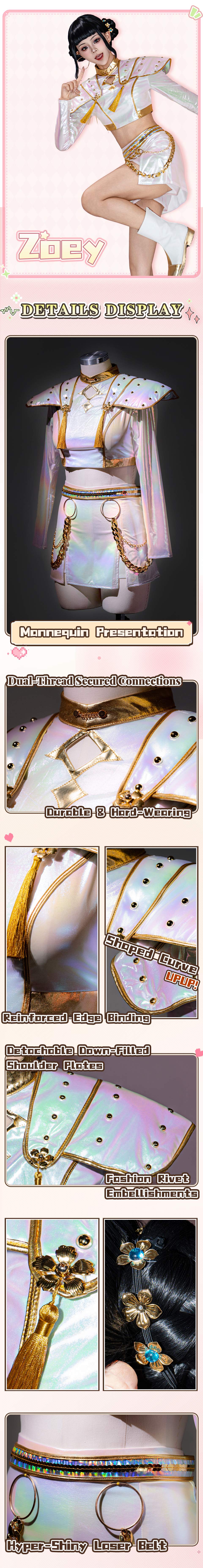 Osias crafted the KPop Demon Hunters Zoey cosplay costume White Stage with Dazzling Laser Design using premium fabrics, tailored top and skirt, gold piping, and detailed accessories for a stage-ready fit.