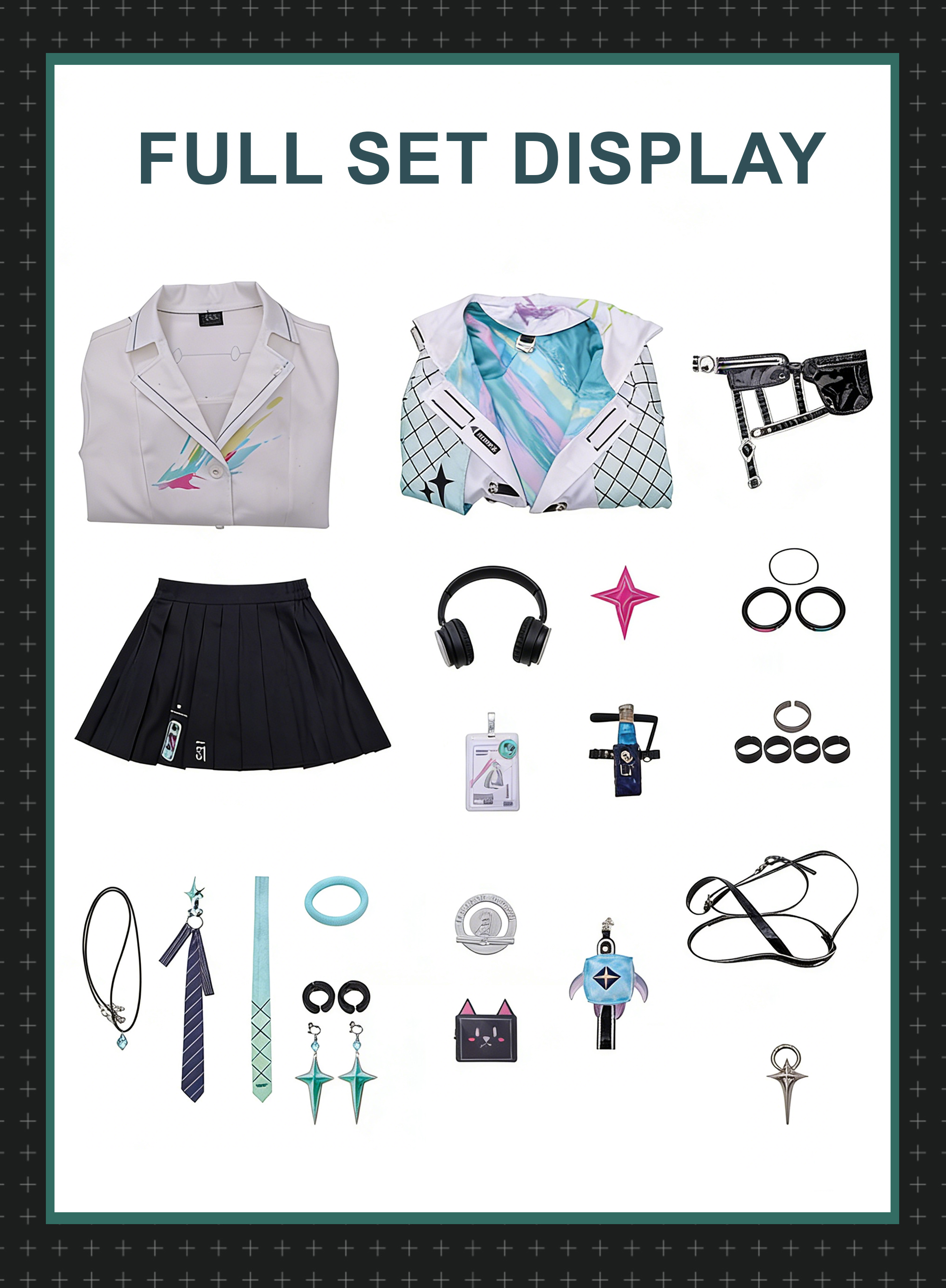Includes Complete Set: Top, skirt, coat, belt, wrist ornaments, rings, necklace, leg ornament, skirt ornament, headwear, tie, earrings, shoulder ornament, badg