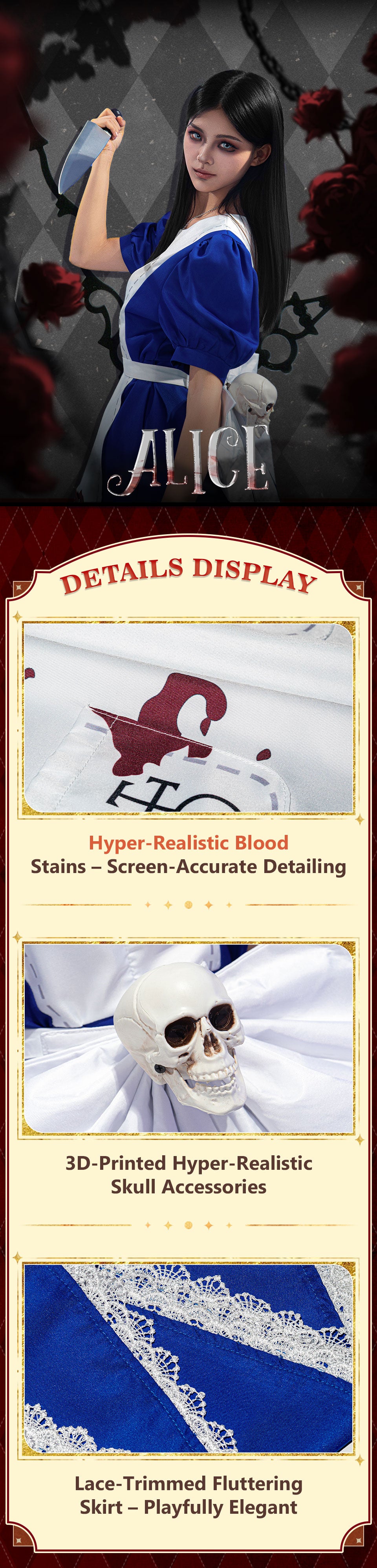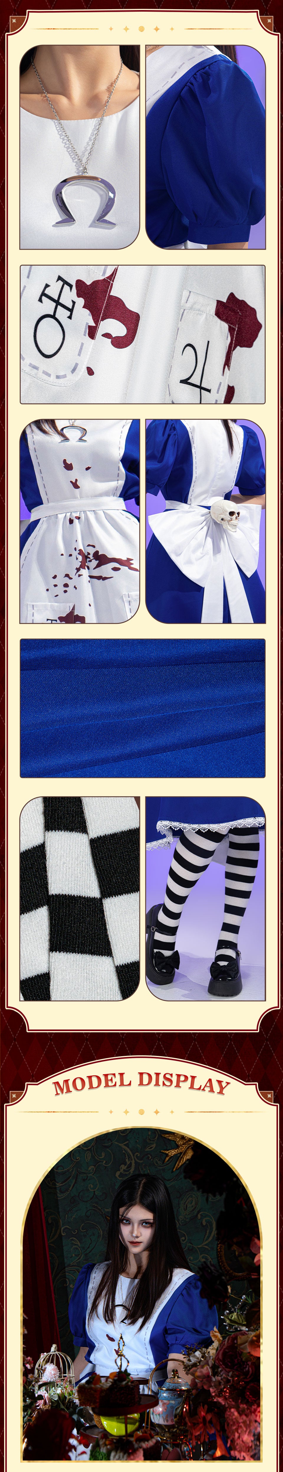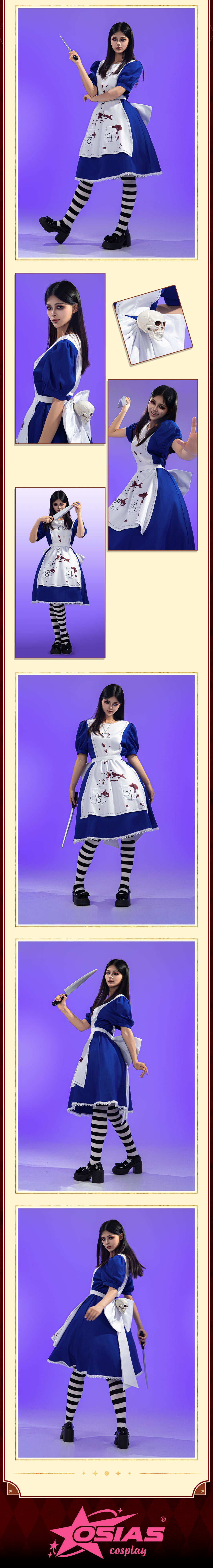 Osias crafted the Alice: Madness Returns Alice cosplay costume with thick, durable fabric, a structured dress, large back bow, waist ornaments, and true-to-US-size fit.