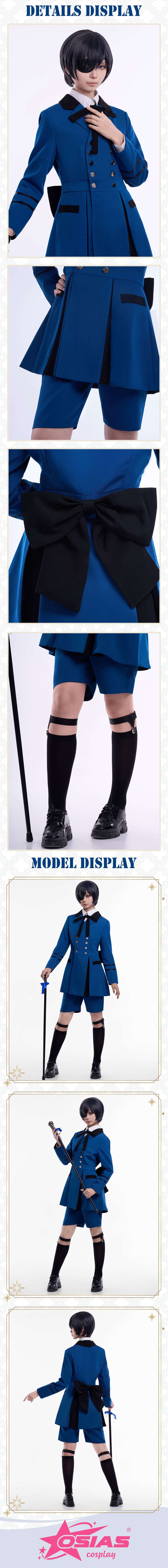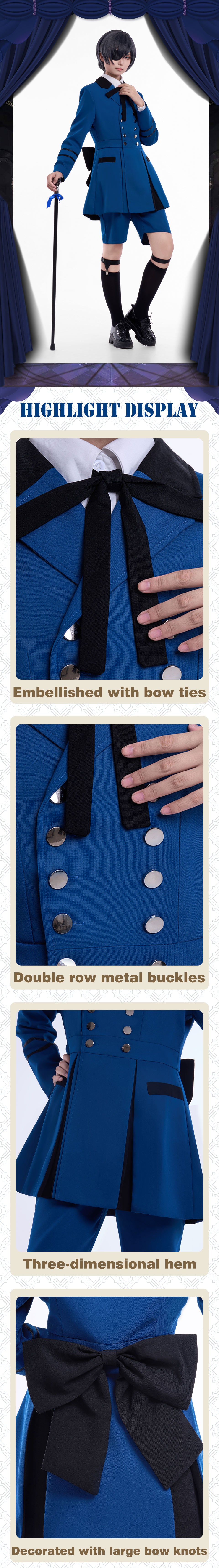 Osias crafted the Black Butler Ciel Phantomhive Uniform cosplay costume with soft, skin-friendly fabric, silver double-breasted buttons, structured shoulder pads, back bow with wire, and true-to-US-size fit.