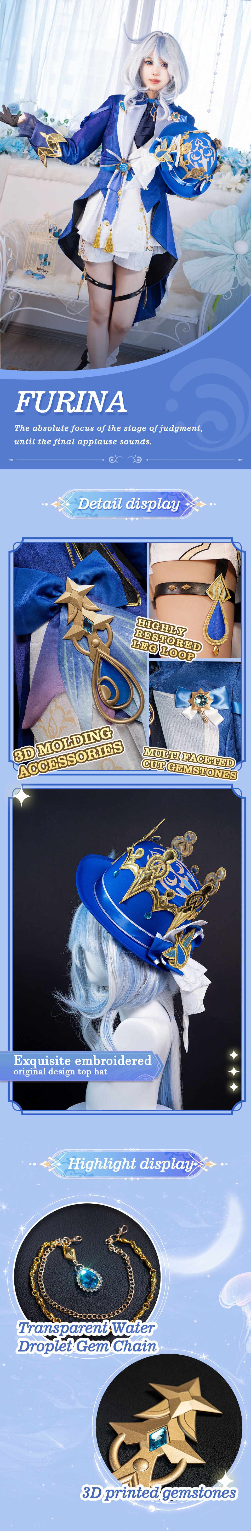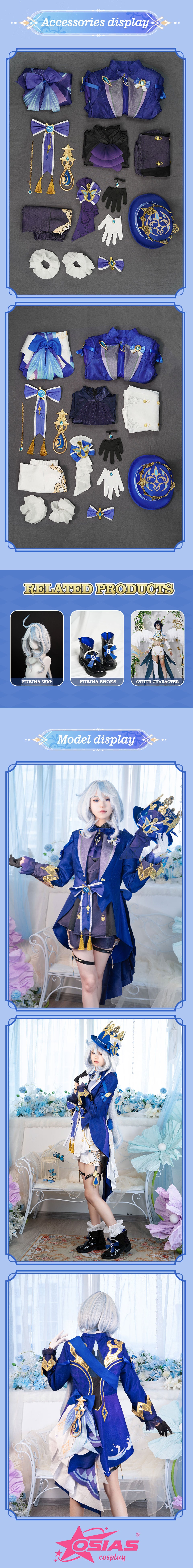 Osias crafted the Genshin Impact Furina Black cosplay costume with premium fabrics, 3D-printed accessories, structured coat, elastic waistband pants, and true-to-US-size fit.