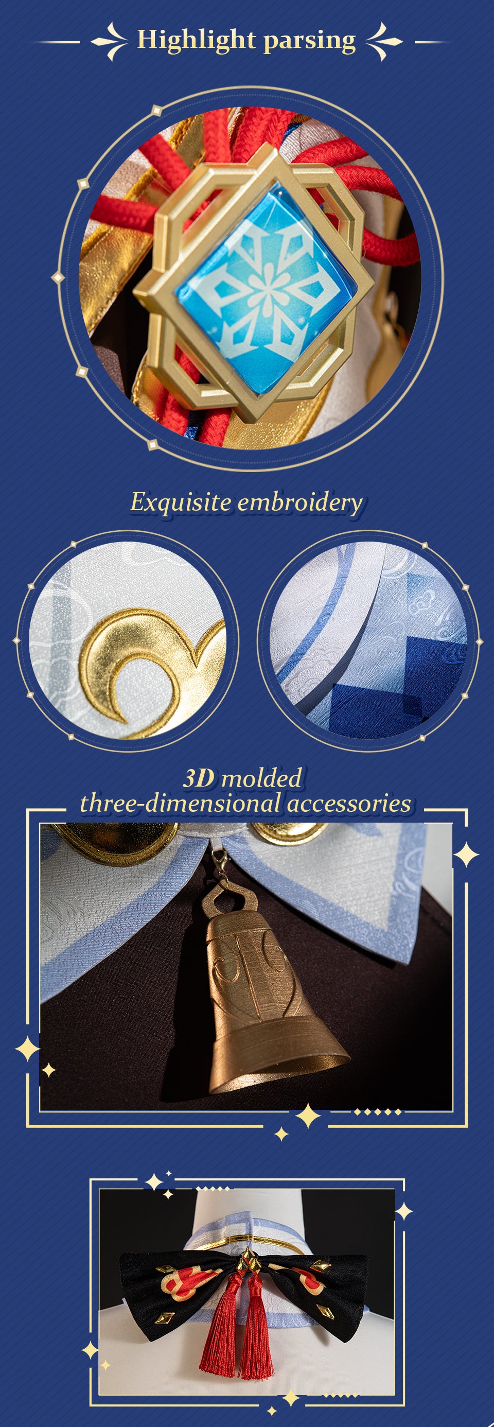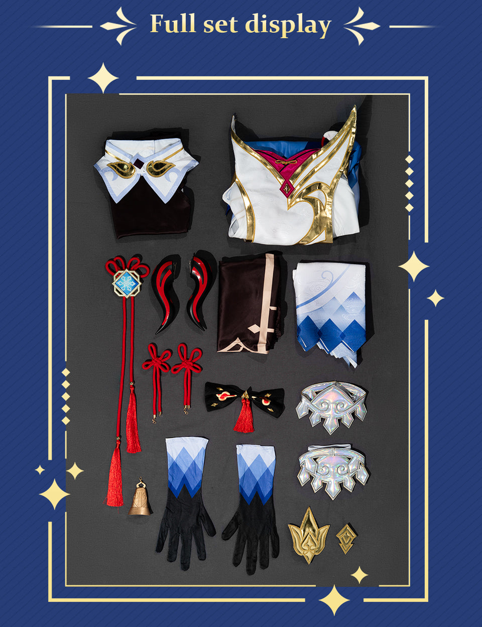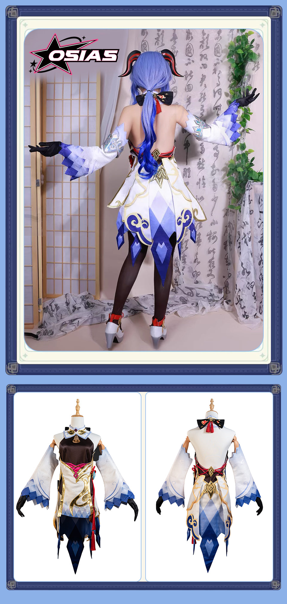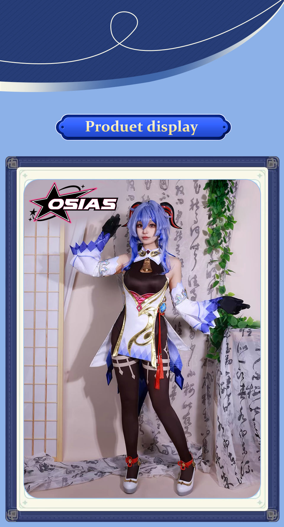 Osias crafted the Genshin Impact Ganyu cosplay costume with embroidered details, tailored silhouette, premium fabrics, elastic waistband skirt, and true-to-US-size fit for accurate cosplay.