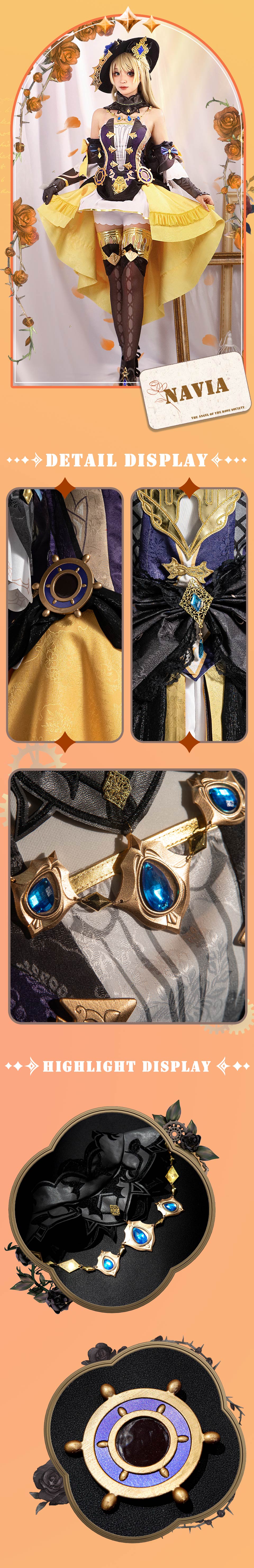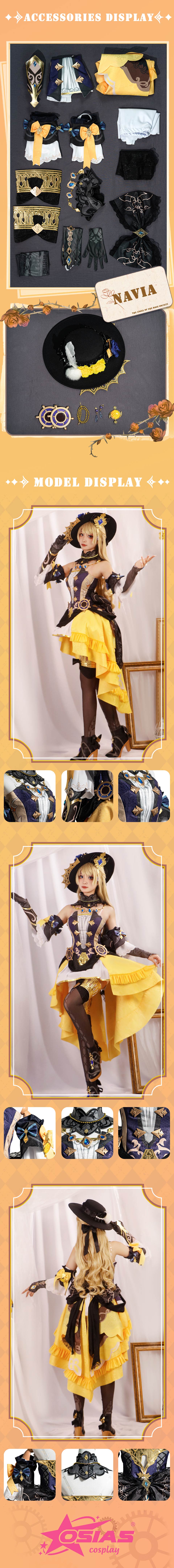 Osias crafted the Genshin Impact Navia cosplay costume with soft, comfortable fabric, a structured top and skirt, and detailed 3D-printed accessories for precise character accuracy.