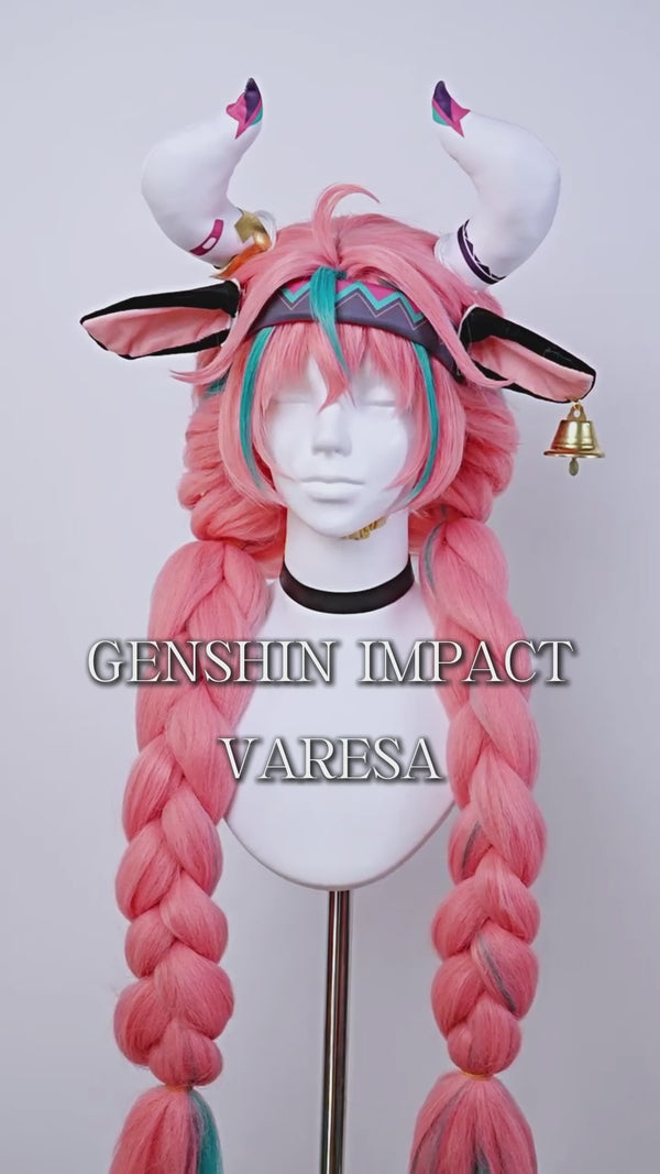Genshin Impact Varesa Cosplay Wig Long Pink and Green With Two Braids