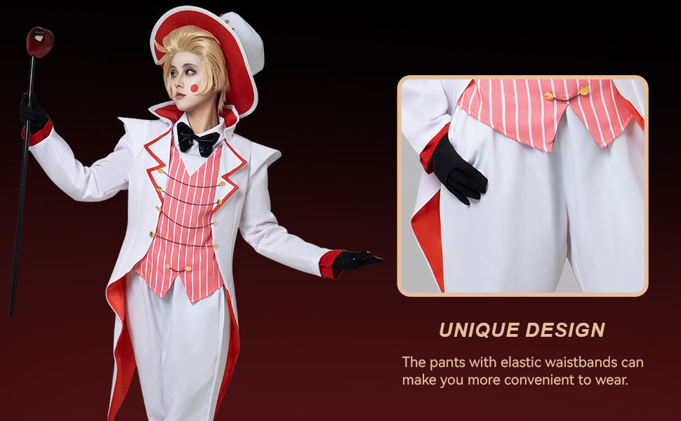 We crafted the Hazbin Hotel Lucifer Morningstar cosplay costume in skin-friendly fabric, featuring a reinforced collar, elastic-waist pants, structured coat, and true US size fit.