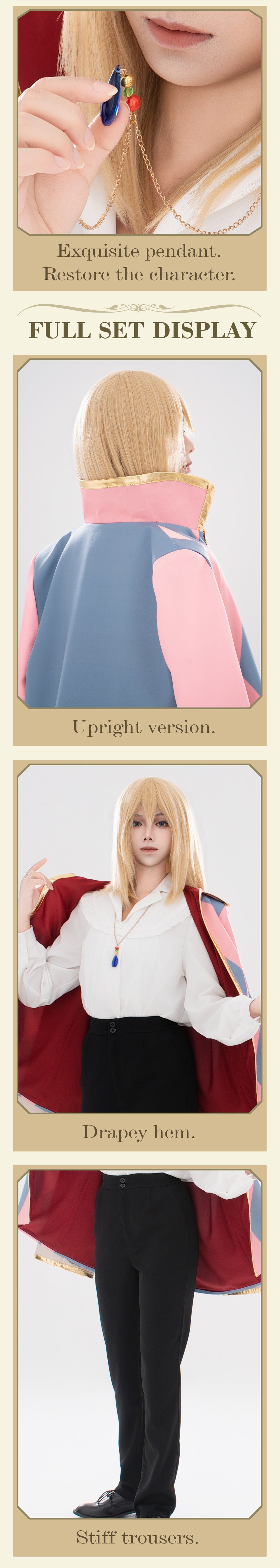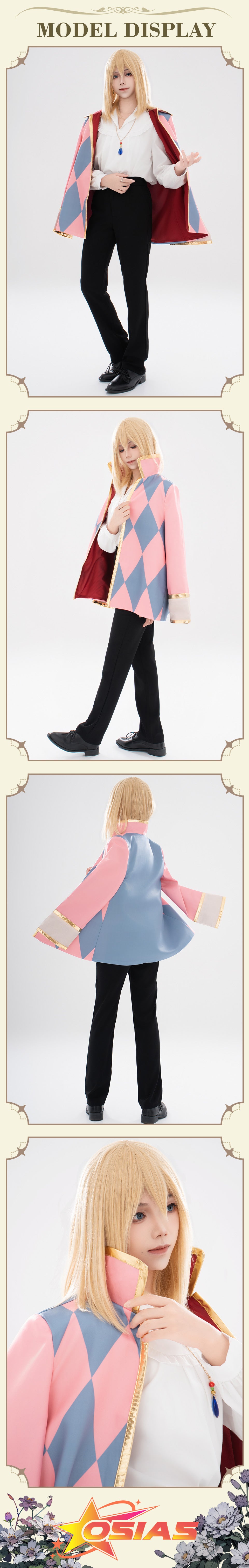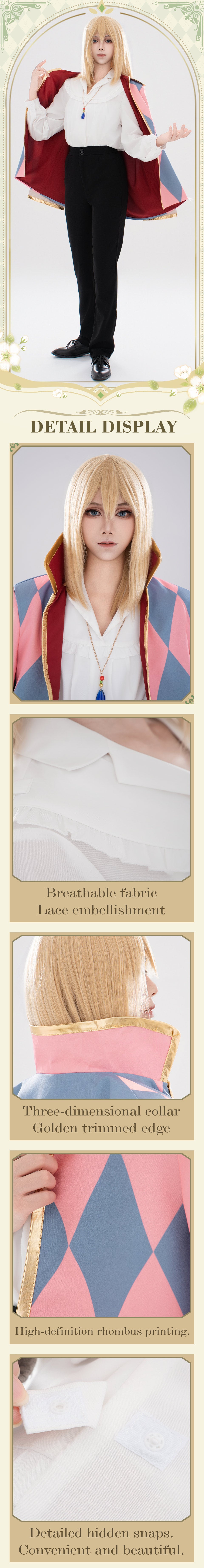 Osias crafted the Howl's Moving Castle Howl cosplay costume with soft, lustrous fabric, gold-trimmed cuffs, upright collar, secure shoulder-buttoned cape, and tailored pants and shirt.