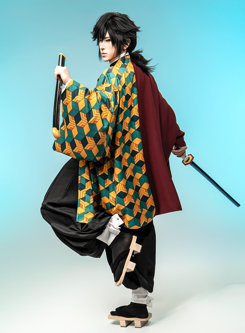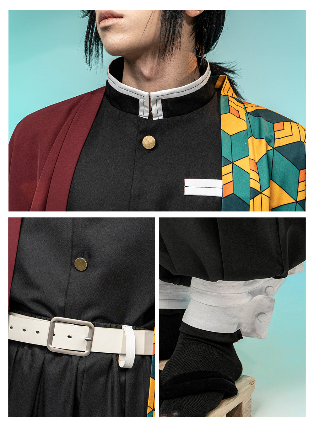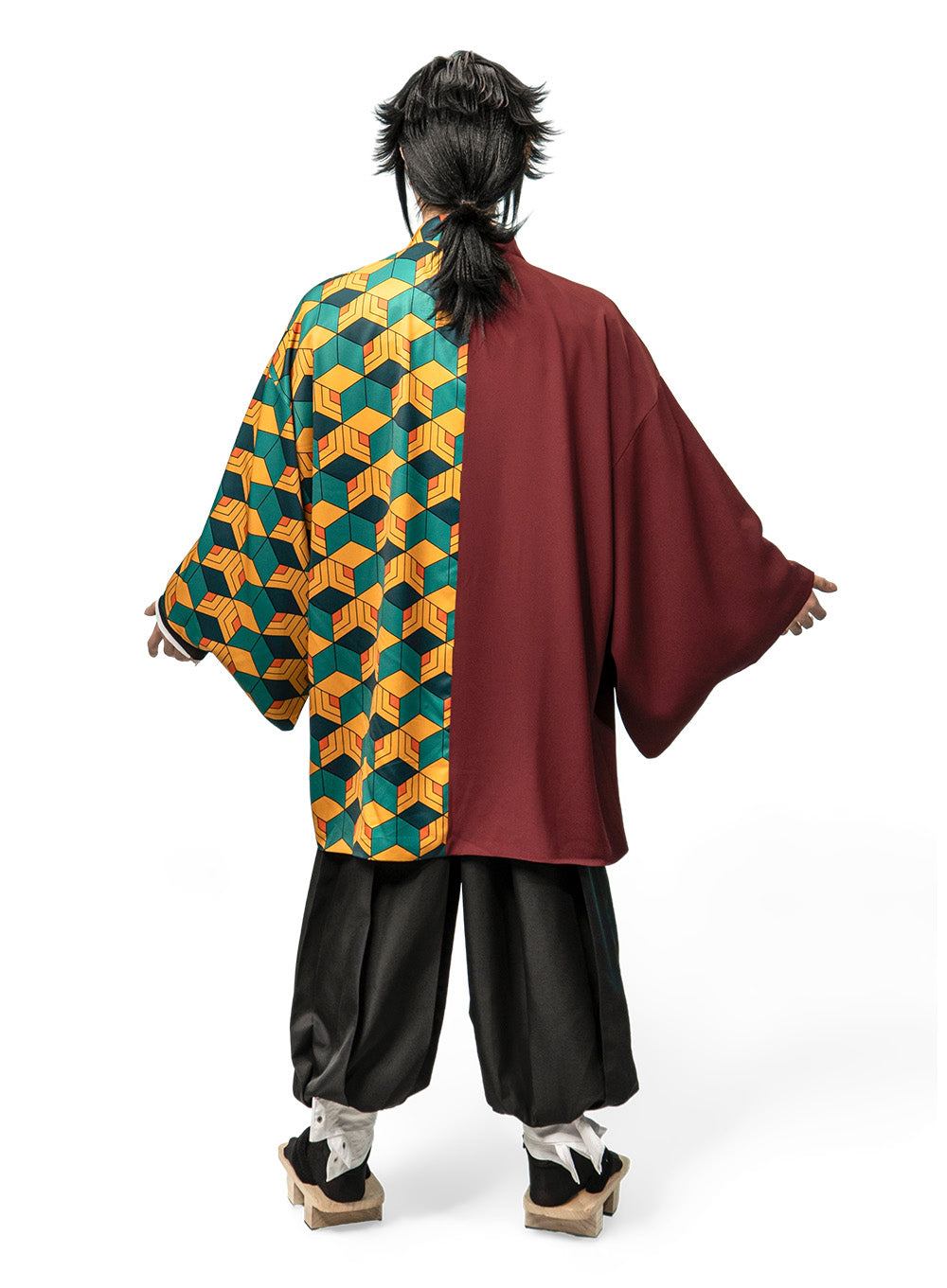 Includes Includes top, iconic haori (long coat), pants, belt, and leg bandages.