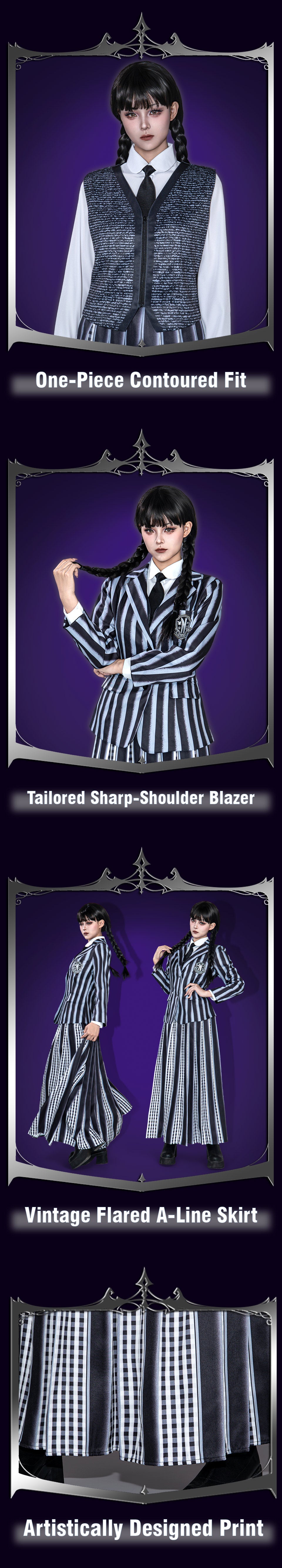 We crafted the Wednesday Wednesday Addams cosplay costume with soft polyester, black-striped school coat, embroidered chest emblem, sleek silhouette, and true-to-US-size comfort.