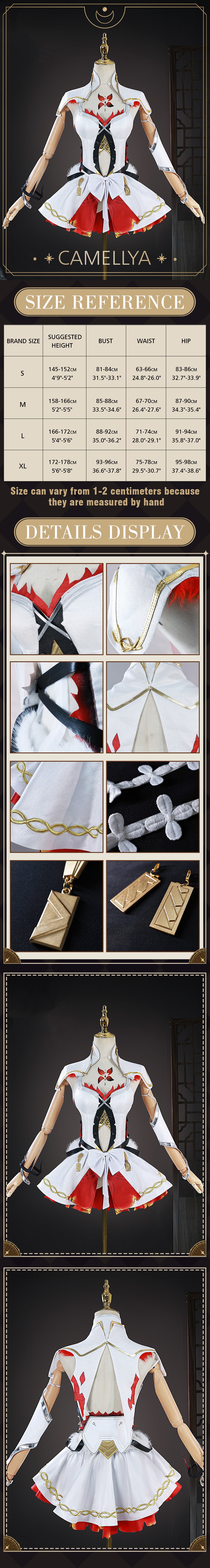 We crafted the Wuthering Waves Camellya cosplay costume with lustrous fabric, gold embroidery, pearl accents, structured dress fit, and durable 3D electroplated ear clips.