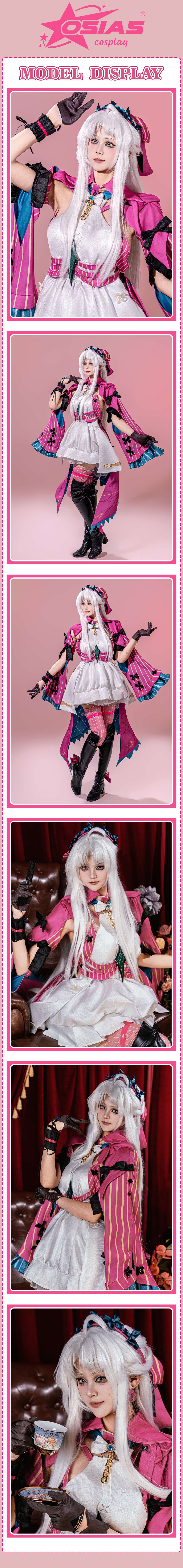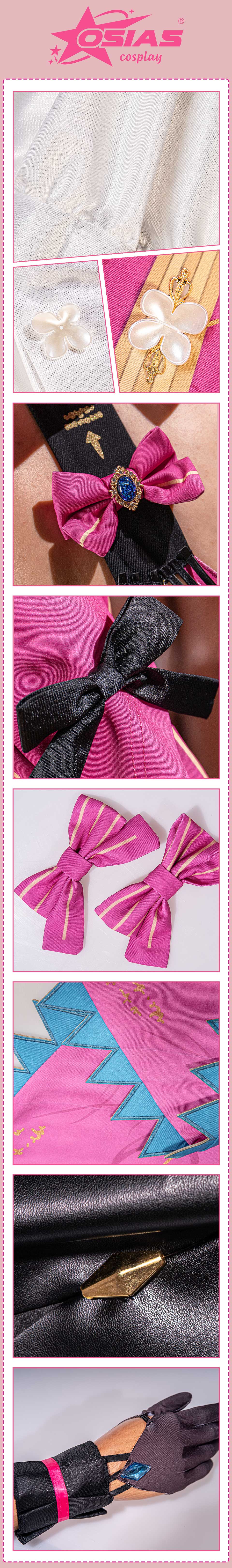 We crafted the Wuthering Waves Carlotta Montelli cosplay costume with glossy fabric, open-back silhouette, color-block design, and detailed 3D accessories for comfort and style.